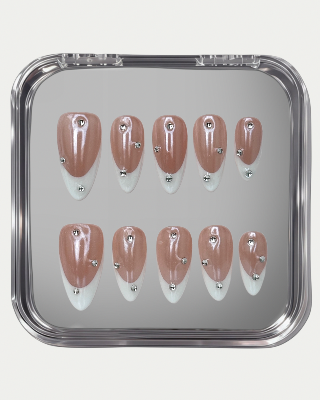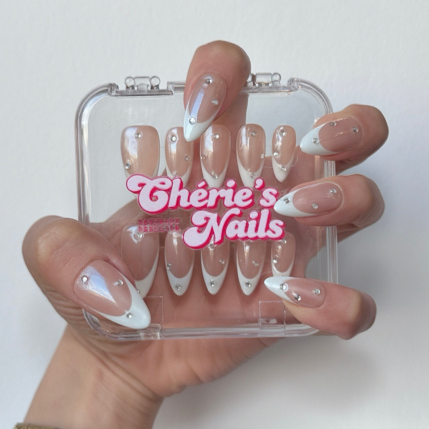Luminous pearl-toned press-on nails with crisp French tips and delicate crystal accents for a refined, modern, and effortlessly polished look.